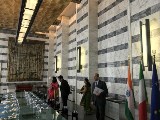 Der italienische Außenminister Enzo Moavero Milanesi und der indische Außenminister Sushma Swaraj heute am 18. Juni 2018 in Rom. Nach einer langen Periode von internationalen Kontroversen: zwei italienische Soldaten erschießen zwei indische Fischer und die indische Polizei im 2013 die zwei Seeleute verhaftete. Heute verbreiteten sich gute Beziehungen zwischen den beiden Ländern einer sehr alten Kultur.