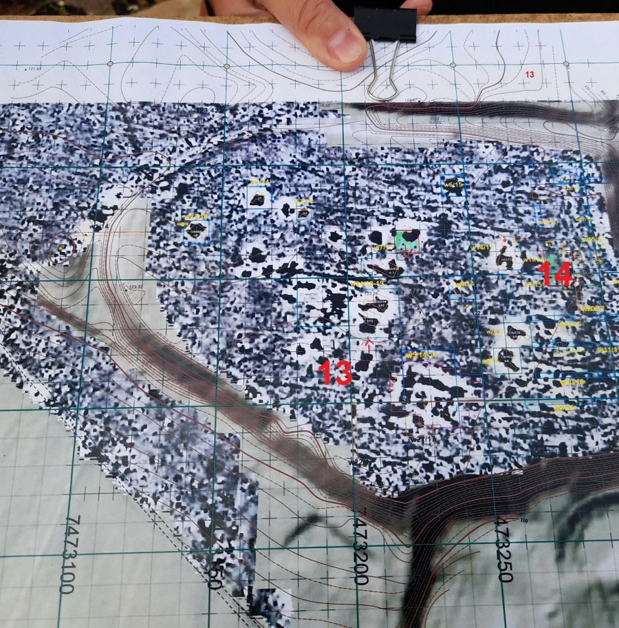 Wir machen uns an die Arbeit und vermessen eine Reihe von Verdachtsflächen. Die endgültige Auswertung der Messergebnisse mit der dreidimensionalen Darstellung des gescannten Untergrundes wird auf den Rechnern der Firma Tero Vido erfolgen. Nach erfolgter Auswertung, welche einige Monate in Anspruch nehmen wird, werden die Grabungsleiter entscheiden, ob an den Stellen Probegrabungen stattfinden sollen. Es handelt sich um die Fläche etwa in der Mitte der Siedlung und noch weitere Flächen im Randbereich, die wir ausmessen sollten. Die ersten Messergebnisse zeigen schon eine Reihe von Anomalien an, die wir ziemlich sicher in der nächsten Grabungskampagne verifizieren werden. Doch auch die aktuelle Grabung ist schon reich an archäologisch hochinteressanten Funden und Befunden.