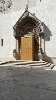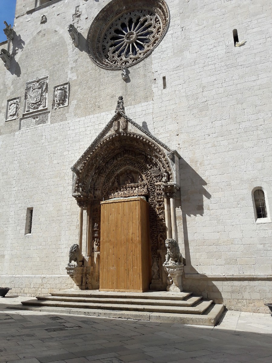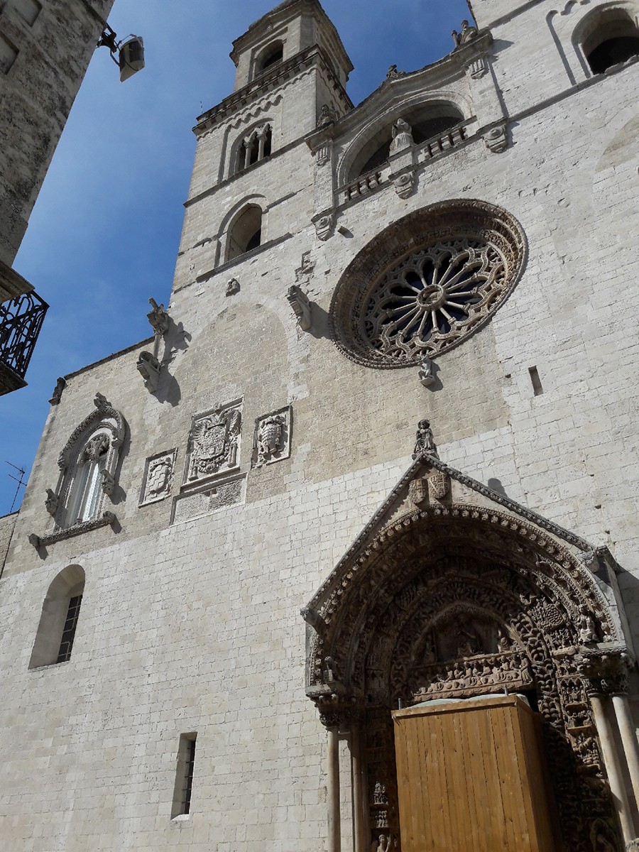 Sehr wenig von der ursprünglichen Federician Pflanze bleibt vom Duomo. Sie sind das Original trifore die Galerien mit Arabesken Säulen und die Pfosten auf der linken Seite der Fassade. Das Portal des frühen fünfzehnten Jahrhunderts wurde von Wanderlehrer und lokalen Arbeitern, tätig in den Denkmälern auf der Achse von Santiago gebracht gemacht de Compostela nach Jerusalem in Puglia kam einen Teil des antiken Via Appia zu berühren. Das Portal ist ein echter Triumph der Dekorationen und Skulpturen von biblischen Themen: in der Lunette der Jungfrau und das Kind inthronisiert mit zwei Engeln zeigt; im Sturz ist das Abendmahl dargestellt;