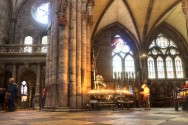 Das Innere des Freiburger Münsters macht den Besucher sprachlos. Herrliche Skulpturen an den Seitenwänden und im Tympanon über dem Eingangsportal. Herrliche Lichtspiele durch die bunten Glasfenster der Südseite. Einige der Fenster, durch die das Licht in das hohe Kirchenschiff fällt, stammen noch aus der Zeit um 1320. Handwerker der verschiedensten Gewerbe, Freiburger Zünfte und Bergleute, machten einen Wettbewerb um das schönste Seitenfenster daraus. Wer genau hinschaut, erkennt noch die Symbole der Gewerbe. Schaut man aus dem Kirchenschiff den Hochchor hinauf, erblickt man die Fenster mit dem Reichsadler und den Wappen der Habsburger. Weltbekannt ist 116 Meter hohe Westturm des Münsters. Wer gut zu Fuß ist, kann über 329 Stufen bis zur obersten Plattform gelangen. Von dort hat man einen phantastischen Blick über die Dächer Freiburgs, den Markt bis zum Schwarzwald und in die Vogesen.