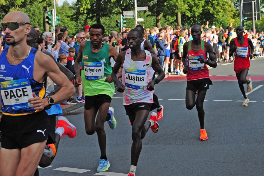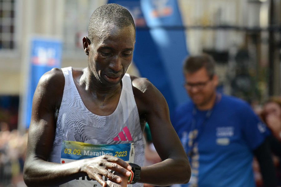 Martin Cheruiyot, Cornelius Kibiwott Chepkock und Justus Kiprotich, das kenianische Quartett, folgte ihm in harmonischem Gleichklang. Nachdem Pfeiffer seinen Dienst nach der Hälfte der Strecke (64:25 Minuten) beendete, waren die Läufer auf sich allein gestellt, während die Temperaturen um die 20 Grad lagen und Windstille herrschte. Charles Muneria, ein wahrhaft unerschrockener Athlet, konnte bereits den Höhepunkt seiner Karriere förmlich riechen. Von den Zuschauern am Straßenrand angefeuert, die sich immer zahlreicher versammelten, je näher das Ziel in Münster-City rückte, hielt er seinen beeindruckenden Laufrhythmus aufrecht. Schließlich erreichte er den Zielbereich auf dem Prinzipalmarkt, wo alljährlich der rote Teppich ausgerollt wird, und finishte inmitten des jubelnden Publikums in beeindruckenden 2:09:06 Stunden.