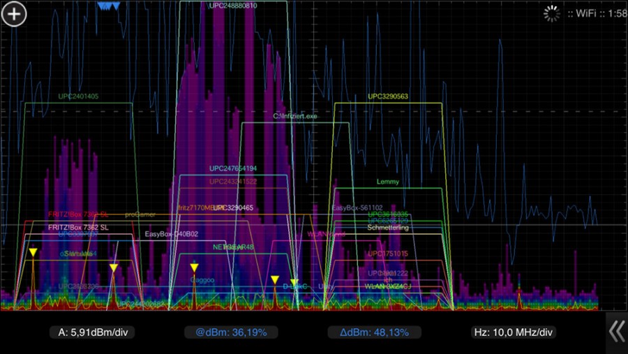 Betrachtet man das nebenstehende Bild kann man leicht erkennen, wie sich die einzelnen Nutzer die Kanäle des 2,4 GHz Bandes teilen. Ein hohes Aufkommen an WLAN Routern ist in Kanal 6 zu erkennen. Doch auch die Nachbarkanäle sind stark belegt, diese stehen jedoch in weiterer Entfernung. Dies lässt sich an der Signalstärke erkennen. Sie ist sehr niedrig und nimmt daher kaum Einfluss auf den eigenen Traffic.Im Kanal 6, das ist der Kanal der in der Mitte dargestellt ist, ist das Signal am stärksten. Hier befindet sich der eigene Router. Auch andere WLAN Router sind mit einem starken Signal am Senden. Durch die hohe Auslastung in Kanal 6 kann es bereits jetzt schon, wenn alle Router einen hohen Traffic verursachen, zu deutlichen Speed Einbußen kommen.